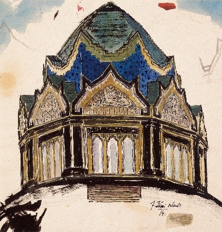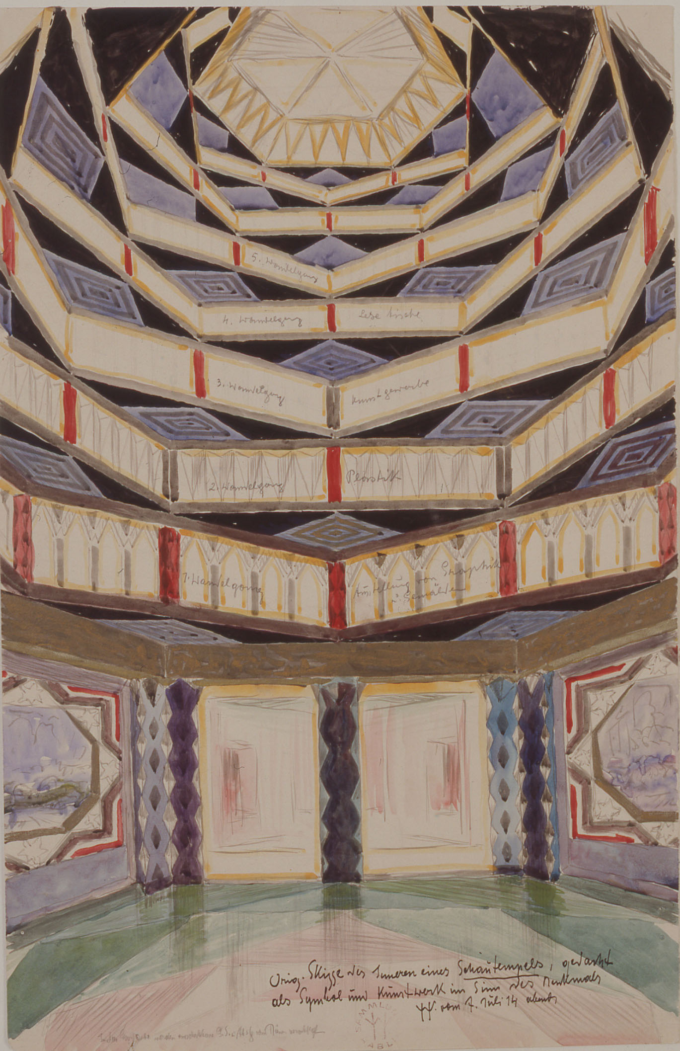 Zur Funktion des Gebäudes vermerkt der Künstler aufschlussreich unten rechts auf dem Blatt: „Orig. Skizze des Inneren eines Schautempel, gedacht als Symbol und Kunstwerk im Sinne des Denkmals WH (ligiert) vom 7. Juli 14 abends“