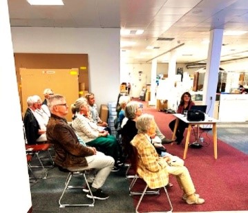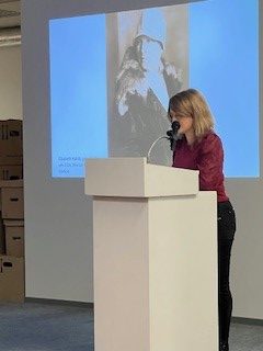 Die stellvertretende Museumsleiterin Janina Willems M.A. berichtete vom  Umzug der Kunstsammlung in das Interims-Magazin in der Feldschmiede 52. Das Wenzel-Hablik-Museum in der Reichenstraße ist für die Sanierung komplett leergeräumt. Eine besondere Herausforderung für die Restauratorinnen und die Arthandler stellte der Transport der großen Ölbilder dar. Mittlerweile lagert alles gut verpackt und trocken im Magazin in der Feldschmiede. Die Gelegenheit der Neulagerung wird auch für weitere Katalogisierungsarbeiten genutzt werden.
