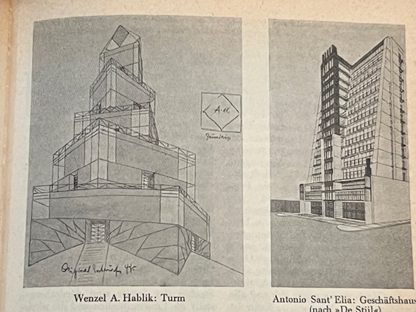 Vergleich von Wenzel Habliks Turm mit einem futuristischen Geschäftshaus von Antonio Sant’Elia in der Architekturzeitschrift „Frühlicht“ 1920.