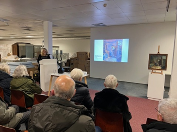 Die stellvertretende Museumsleiterin Janina Willems M.A. berichtete vom Umzug der Kunstsammlung in das Interims-Magazin in der Feldschmiede 52. Das Wenzel-Hablik-Museum in der Reichenstraße ist für die Sanierung komplett leergeräumt. Eine besondere Herausforderung für die Restauratorinnen und die Arthandler stellte der Transport der großen Ölbilder dar. Mittlerweile lagert alles gut verpackt und trocken im Magazin in der Feldschmiede. Die Gelegenheit der Neulagerung wird auch für weitere Katalogisierungsarbeiten genutzt werden.